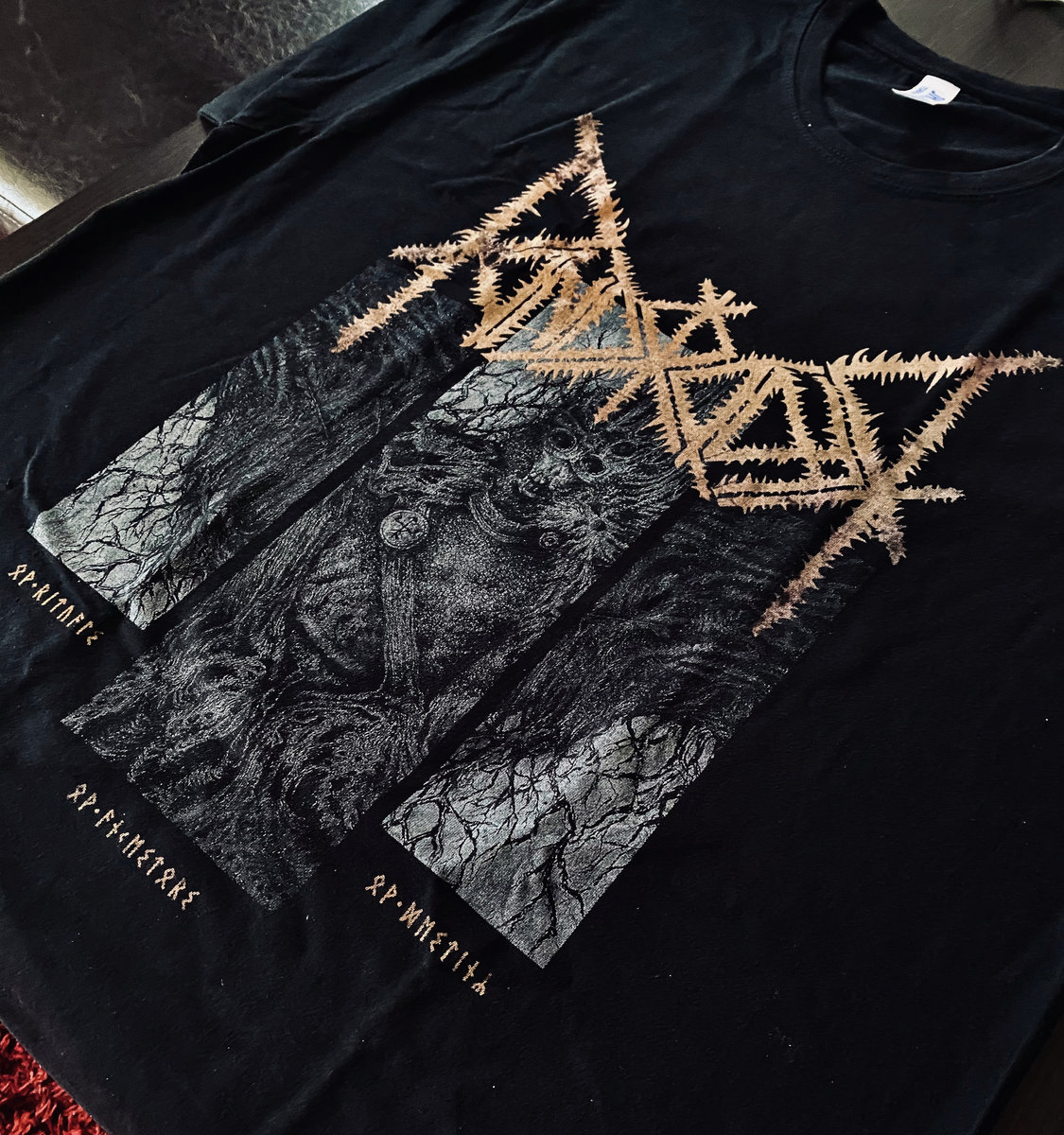 Runes translation on T-shirt: "Ov Rituals, Ov Ancestors, Ov Destiny"